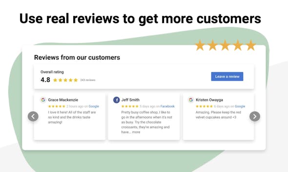 Display your reviews on your website with our integrated review display widget to gain the trust of your next customer.Â